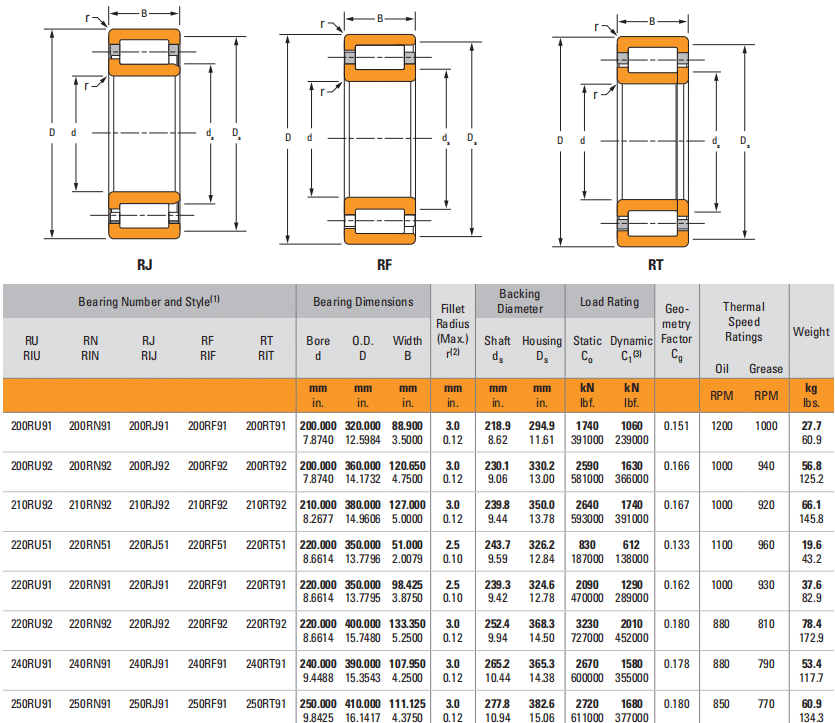 | RU RIU | RN RIN | RJ RUJ | RF RIF | RT RIT | Bore d | 0.D. D | Widthย B | Radiusย (Max.) r2 | Shaftย Housingย dโย ย ย ย ย ย ย ย ย ย ย ย ย ย Dใ | Staticย Dynamicย Cใย ย ย ย C, | ||||