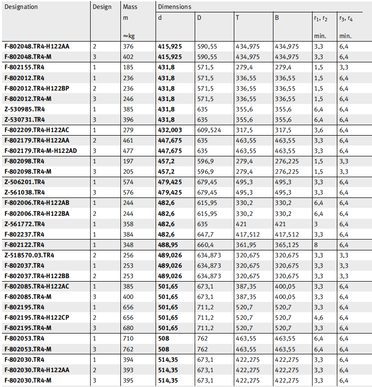 Four-row tapered roller bearings comprise solid bearing rings and tapered roller and cage assemblies. They are suitable for axial loads in both directions and high radial loads.