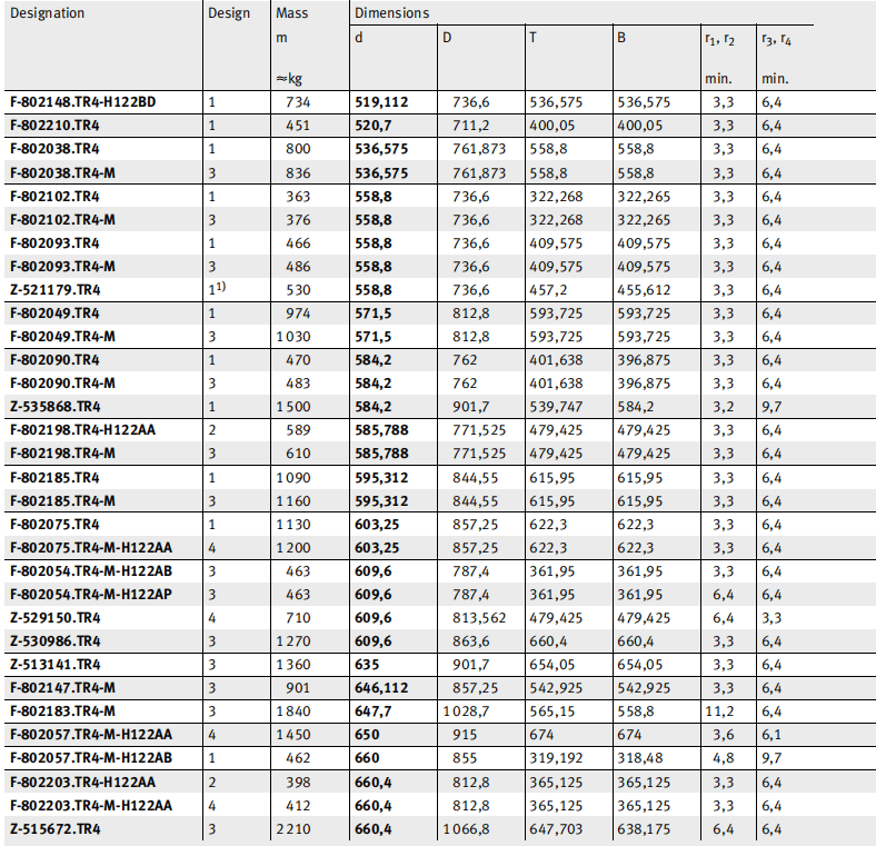Four-row tapered roller bearings comprise solid bearing rings and tapered roller and cage assemblies. They are suitable for axial loads in both directions and high radial loads.