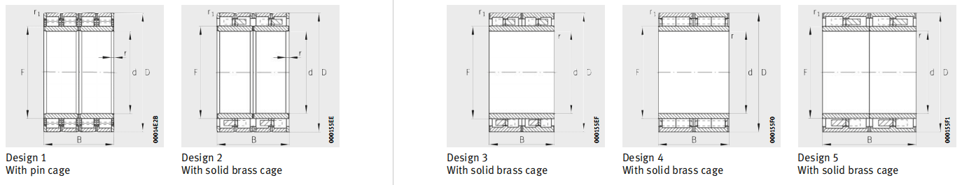 Four-row cylindrical roller bearings comprise solid bearing rings and