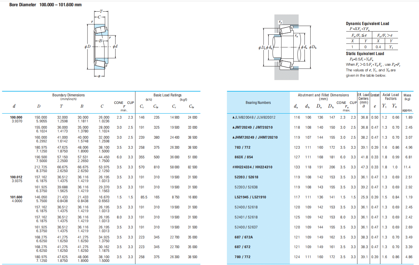 | Bearing Numbers | Abutment and Fillet Dimensions (mm) CONE CUP | Eff. Load Centers (mm) | Constant e | Axial Load Factors Y1 Y0 | Mass (kg) approx. | ||||||