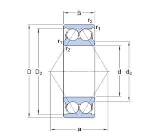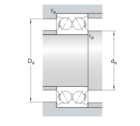 The design of SKF double row angular contact ball bearings corresponds to two single row angular contact ball bearings arranged back-to-back.