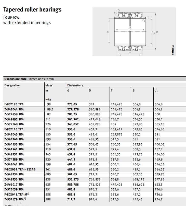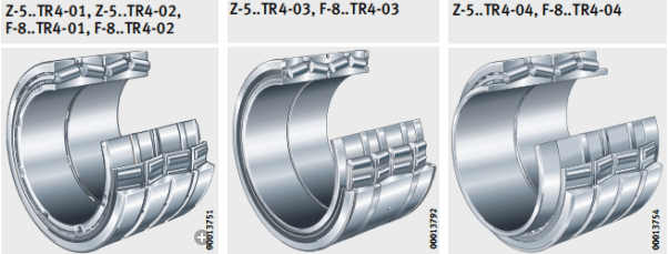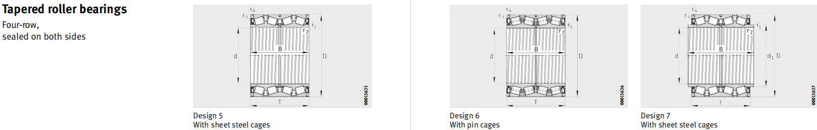 Four-row tapered roller bearings comprise solid bearing rings and tapered roller and cage assemblies. They are suitable for axial loads in both directions and high radial loads.