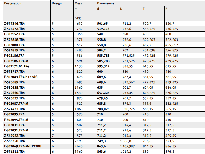 Four-row tapered roller bearings comprise solid bearing rings and tapered roller and cage assemblies. They are suitable for axial loads in both directions and high radial loads.