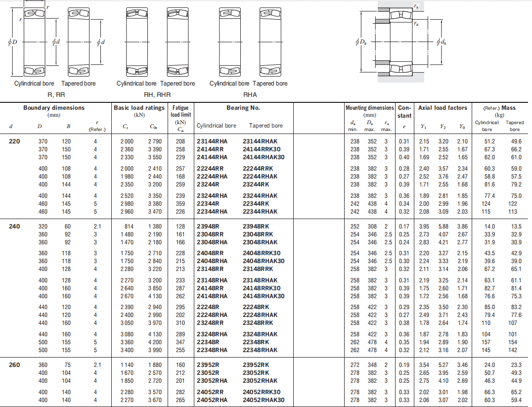 | 240 | 320 360 360 360 360 400 400 400 400 440 440 440 440 500 500 | 60 92 92 118 118 128 128 160 160 120 120 160 160 155 155 | 2.1 3 3 3 3 4 4 4 4 4 4 4 4 5 5 | 1 1 1 1 2 2 2 2 2 2 3 3 3 3 | 814 480 470 750 750 280 270 640 670 390 400 050 080 360 400 | 1 2 2 2 2 3 3 3 4 2 2 3 4 4 3 | 380 190 180 710 840 220 200 850 130 940 990 970 130 200 990 | 128 161 166 228 215 213 233 287 262 295 202 310 289 347 255 | 23948R 23048RR 23048RHA 24048RR 24048RHA 23148RR 23148RHA 24148RR 24148RHA 22248R 22248RHA 23248RR 23248RHA 22348R 22348RHA | 23948RK 23048RRK 23048RHAK 24048RRK30 24048RHAK30 23148RRK 23148RHAK 24148RRK30 24148RHAK30 22248RK 22248RHAK 23248RRK 23248RHAK 22348RK 22348RHAK |