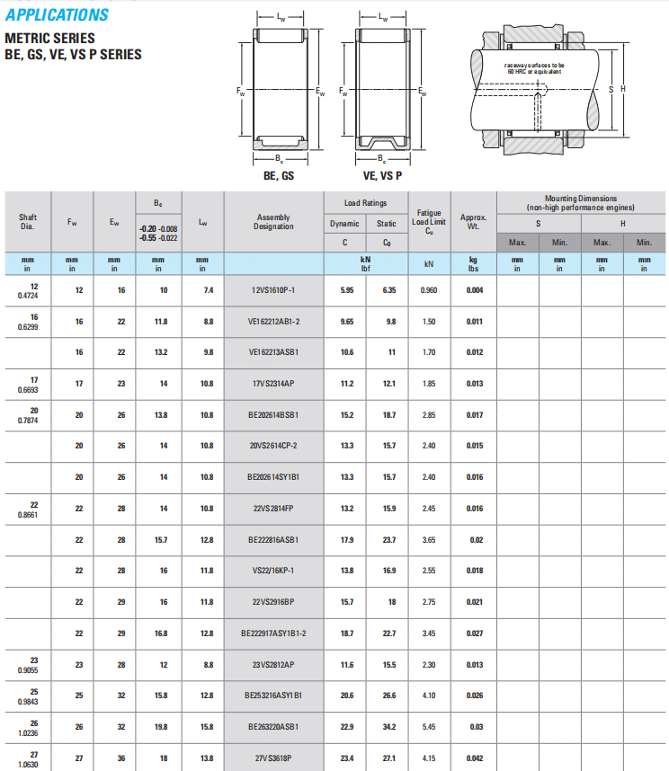 | Shaft Dia. | Fw | Ew | Bc | Lw | Assembly Designation | Load Ratings | Fatigue Load Limit Cu | Approx. Wt. | |