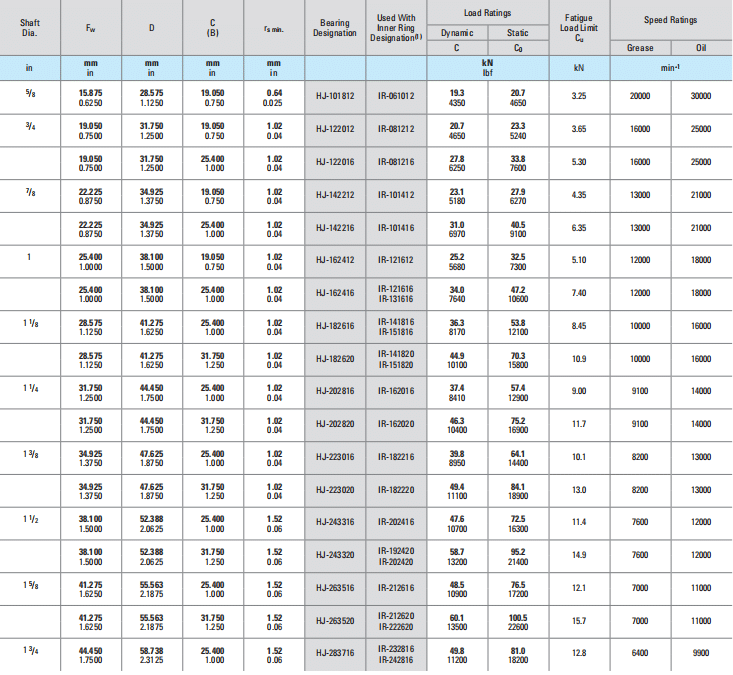 | 13/8 | 34.925 1.3750 | 47.625 1.8750 | 25.400 1.000 | 1.02 0.04 | HJ-223016 | IR-182216 | 39.8 8950 | 64.1 14400 | 10.1 | 8200 | 13000 |