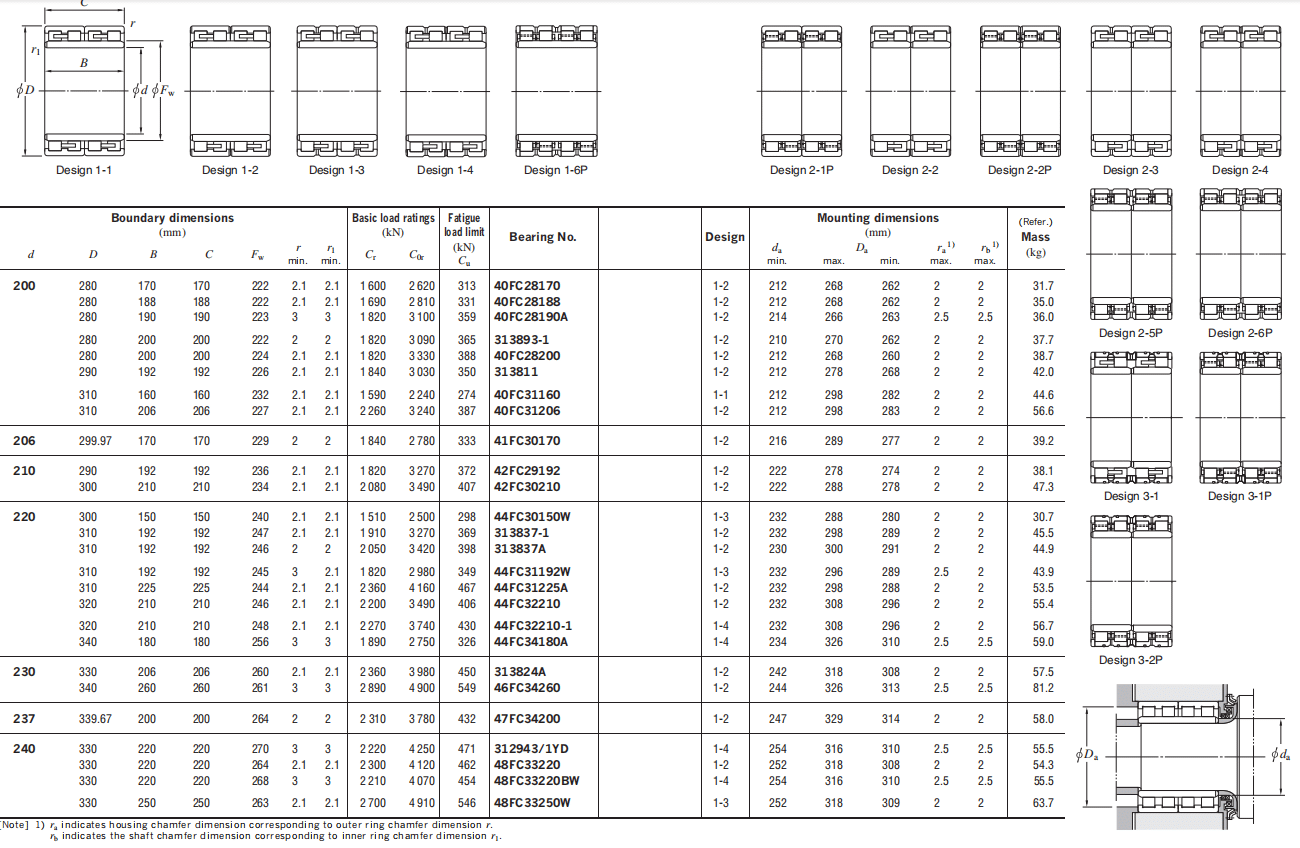 | d | Boundary dimensions (mm) D B C | Fw | r min. | r1 min. | Basic load ratings (kN) Cr C0r | Fatigue load limit (kN) Cu | Bearing No. | Design | da min. | Mounting dimensions (mm) Da ra 1) max. min. max. | rb 1) max. | (Refer.) Mass (kg) | ||||||||