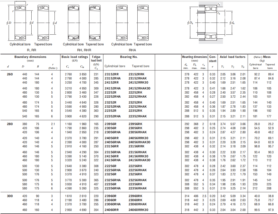 | 260 | 440 440 440 440 480 480 480 480 540 540 | 144 144 180 180 130 130 174 174 165 165 | 4 4 4 4 5 5 5 5 6 6 | 2 2 3 3 2 2 3 3 3 3 | 760 790 250 210 800 790 440 590 540 900 | 3 4 4 4 3 3 4 4 4 4 | 850 000 700 950 460 430 640 900 380 620 | 231 285 345 309 347 226 326 280 363 290 | 23152RR 23152RHA 24152RR 24152RHA 22252R 22252RHA 23252R 23252RHA 22352R 22352RHA | 23152RRK 23152RHAK 24152RRK30 24152RHAK30 22252RK 22252RHAK 23252RK 23252RHAK 22352RK 22352RHAK |