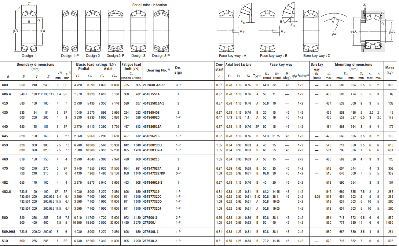 | d | Boundary dimensions (mm) Dย ย ย ย ย ย ย ย ย ย ย ย Tย ย ย ย ย ย ย ย ย ย B | rย 3) min. | r1ย 3) min. | Basicย loadย ratingsย (kN) Radialย ย ย ย ย ย ย ย ย ย ย ย ย ย Axial Cr ย ย ย ย ย ย ย ย ย ย ย ย ย ย C0r ย ย ย ย ย ย ย ย ย ย ย ย ย ย Ca ย ย ย ย ย ย ย ย ย ย ย ย ย ย C0a | Fatigueย load limit (kN) Cu (Radial)ย ย (Axial) | Bearingย No. 1) | ||||||||||