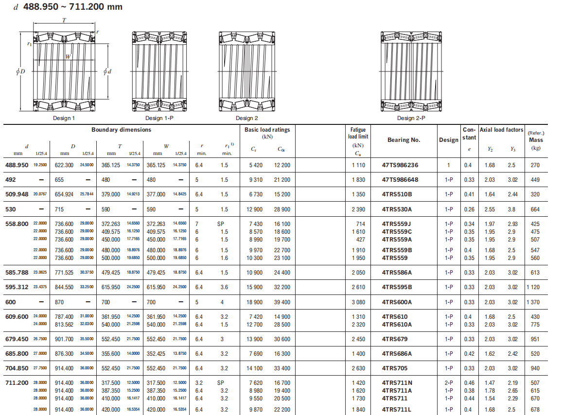 | Boundary dimensions d D T W r mm 1/25.4 mm 1/25.4 mm 1/25.4 mm 1/25.4 min. | r1 1) min. | Bearing No. | Design | Con- stant e | Axial load factors