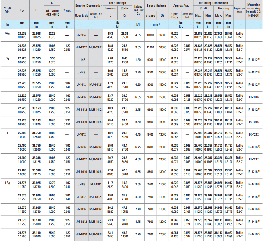 | 25.400 1.0000 | 31.750 1.2500 | 25.40 1.000 | 1.02 0.040 | J-1616 | MJ-16161 | 25.0 5610 | 43.4 9760 | 6.75 | 8400 | 13000 | 0.035 0.077 | 0.042 0.092 | 25.400 1.0000 | 25.387 0.9995 | 31.763 1.2505 | 31.737 1.2495 | Tableย B2-7 | IR-1216(1) | |