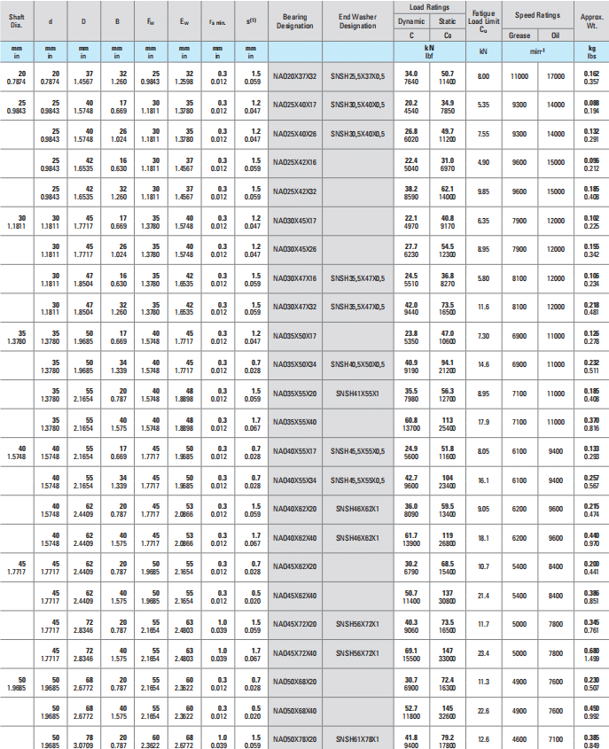 | 45 1.7717 | 62 2.4409 | 40 1.575 | 50 1.9685 | 55 2.1654 | 0.3 0.012 | 0.5 0.020 | NAO45X62X40 | 50.7 11400 | 137 30800 | 21.4 | 5400 | 8400 | 0.386 0.851 | ||