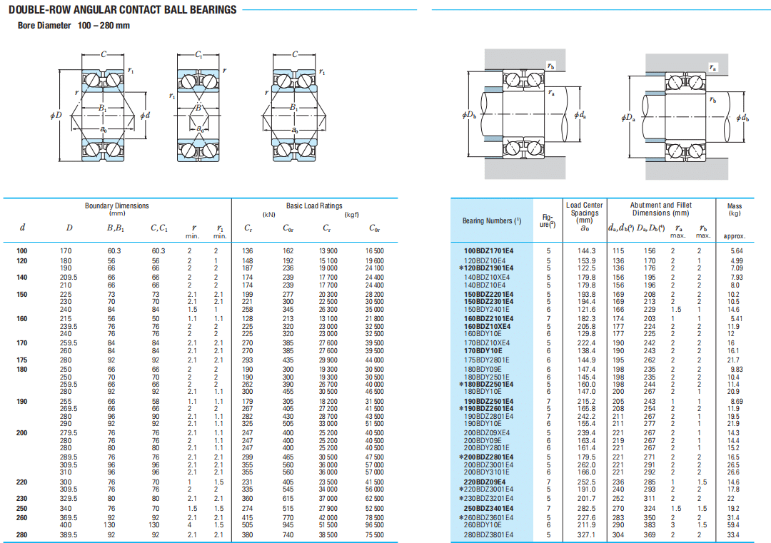 | Bearing Numbers (1) | Fig- ure(2) | Load Center Spacings (mm) | Abutment and Fillet Dimensions (mm) da ,db (3) Da,Db (4) ra max . | rb max . | Mass (kg) approx . | ||