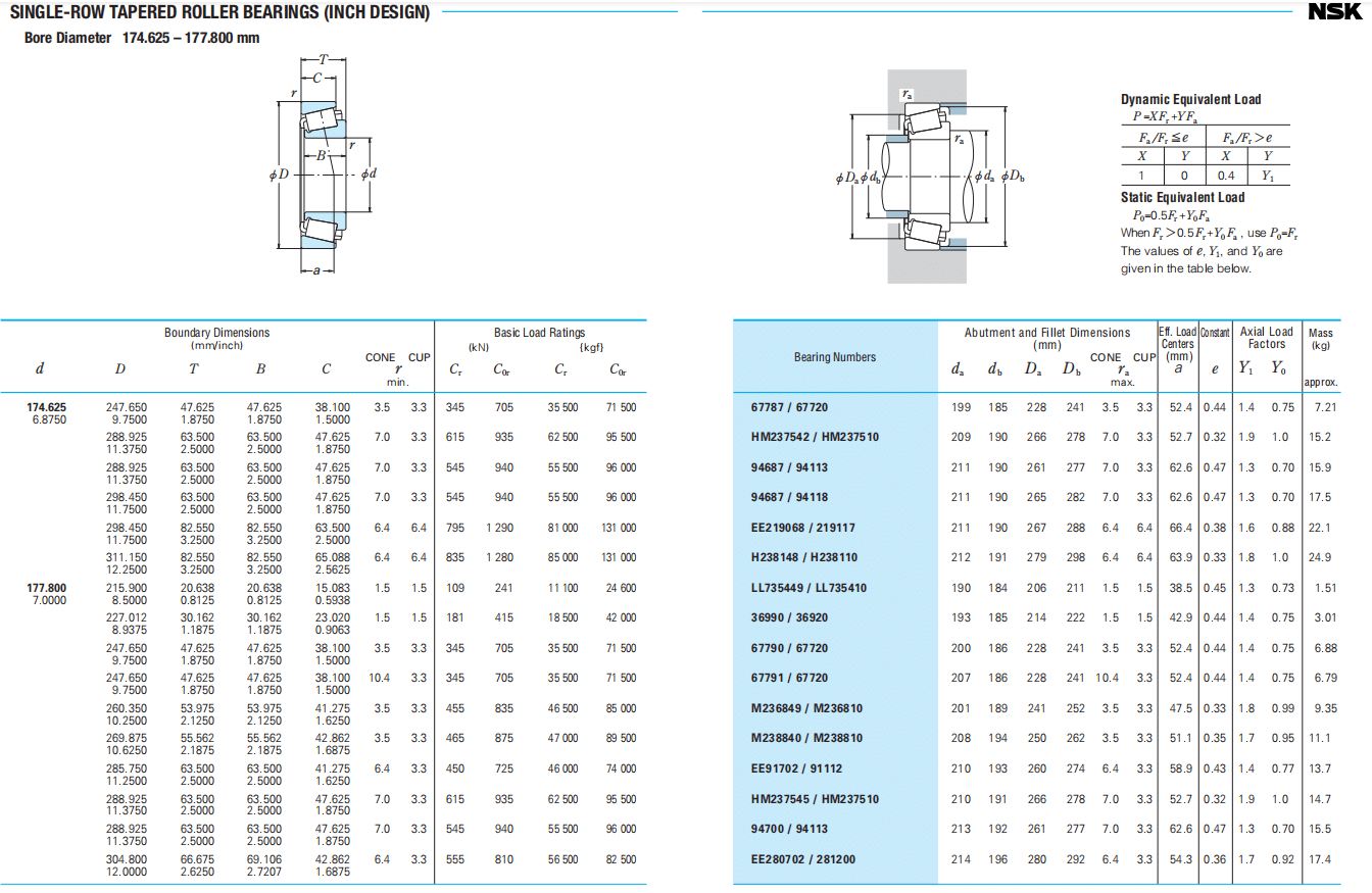 | Bearing Numbers | Abutment and Fillet Dimensions (mm) CONE CUP | Eff. Load Centers (mm) | Constant e | Axial Load Factors Y1 Y0 | Mass (kg) approx. | ||||||