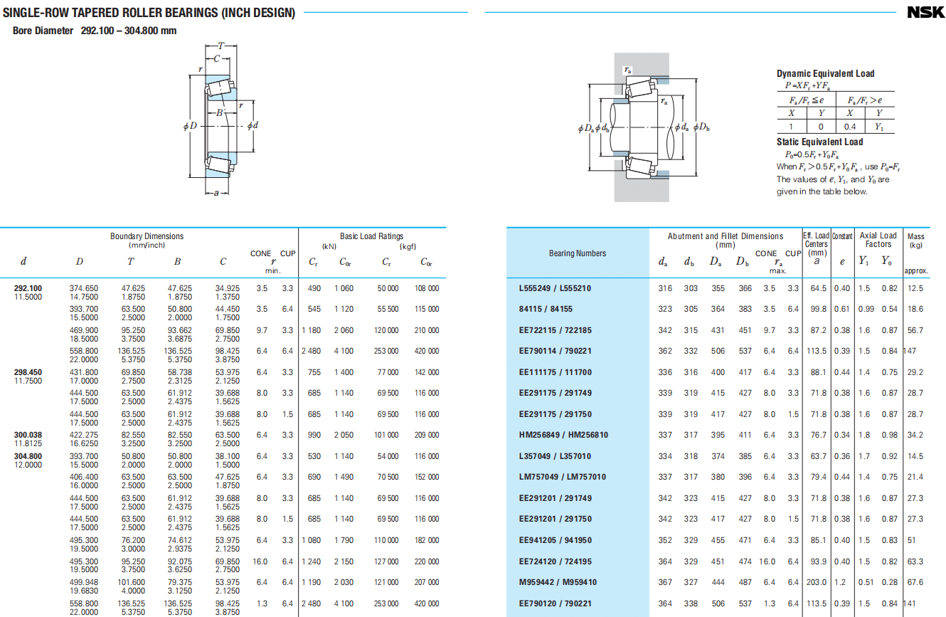| Bearing Numbers | Abutment and Fillet Dimensions (mm) CONE CUP | Eff. Load Centers (mm) | Constant e | Axial Load Factors Y1 Y0 | Mass (kg) approx. | ||||||