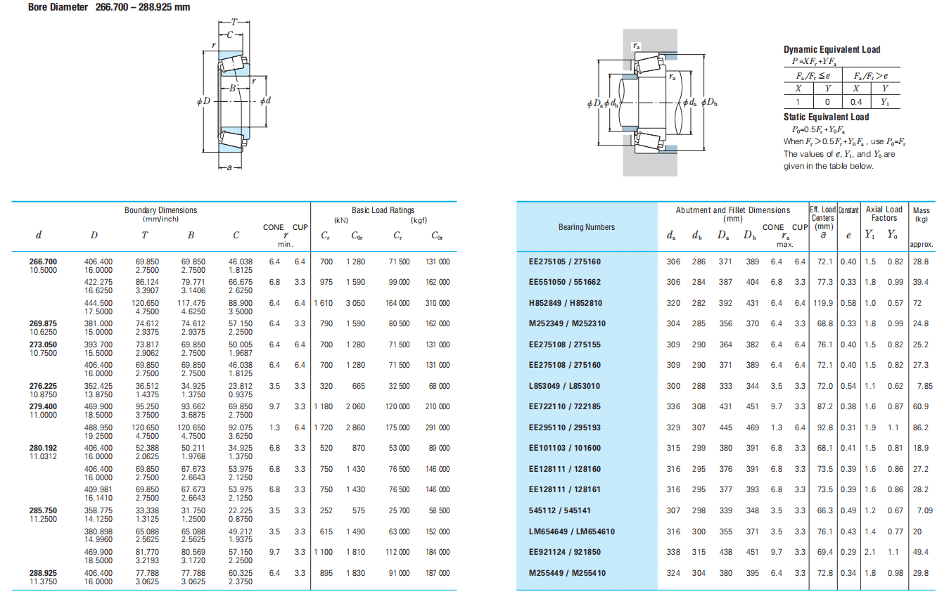 | Bearing Numbers | Abutment and Fillet Dimensions (mm) CONE CUP | Eff. Load Centers (mm) | Constant e | Axial Load Factors Y1 Y0 | Mass (kg) approx. | ||||||