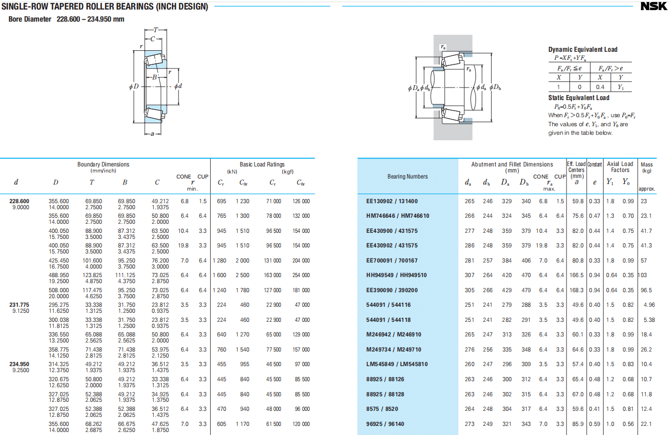 | Bearing Numbers | Abutment and Fillet Dimensions (mm) CONE CUP | Eff. Load Centers (mm) | Constant e | Axial Load Factors Y1 Y0 | Mass (kg) approx. | |||||