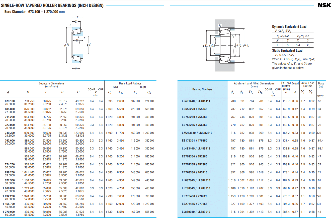 | Bearing Numbers | Abutment and Fillet Dimensions (mm) CONE CUP | Eff. Load Centers (mm) | Constant e | Axial Load Factors Y1 Y0 | Mass (kg) approx. | |||||||