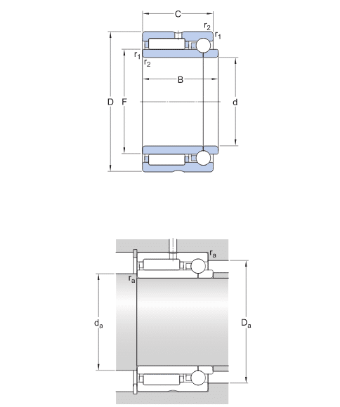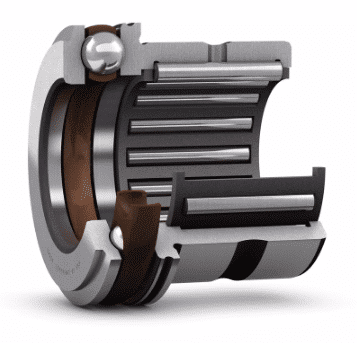 These bearings consist of a radial needle roller bearing combined with an angular contact ball bearing. Together they can accommodate both heavy radial loads and light axial loads in both directions. In addition, they can operate at high speeds. Their low cross-sectional height makes the bearings particularly suitable for applications where other types of locating bearing arrangements occupy too much space.