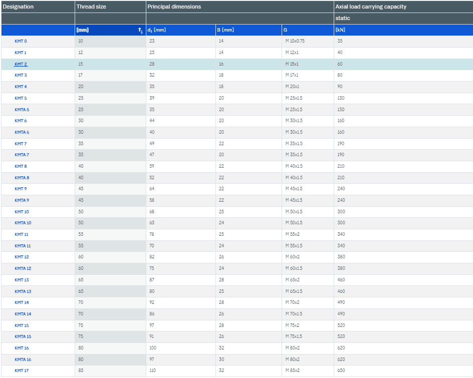 DesignationThread sizePrincipal dimensionsAxial load carrying capacity