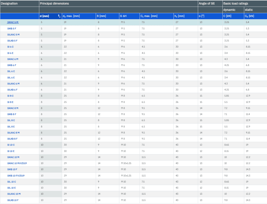 DesignationPrincipal dimensionsAngle of tiltBasic load ratings