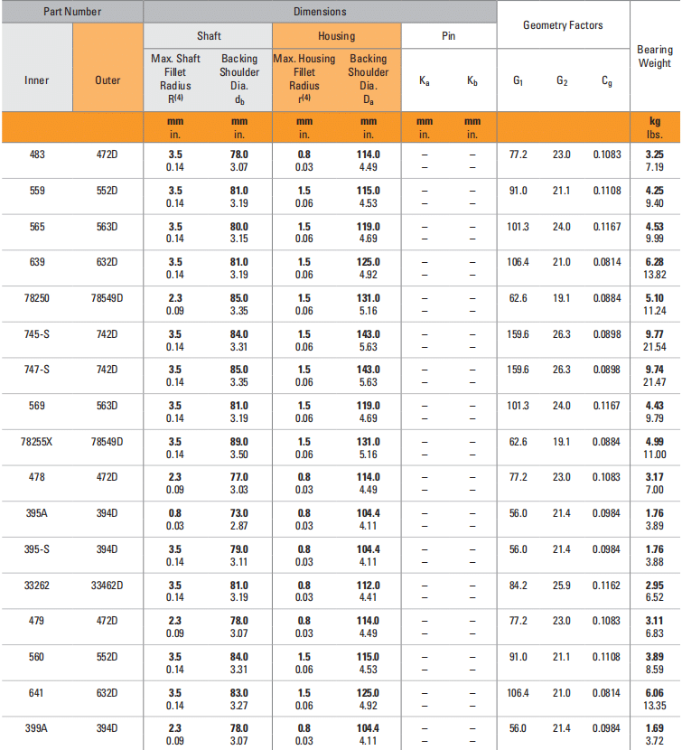 | Max. Shaft Fillet Radius R(4) | Backing Shoulder Dia. db | Max. Housing Fillet Radius r(4) | Backing Shoulder Dia. Da | Ka Kb | G1 | G2 | Cg | |||||