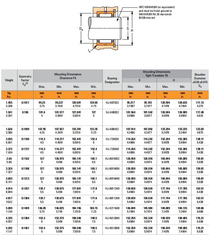 | Weight | Geometry Factor Cย (1) g | Max. | Mounting Dimensions Clearance Fit Min.ย ย ย ย ย ย ย ย ย ย ย ย ย Max. | Min. | Bearing Designation | Mounting Dimensions Tight Transition Fit | ||||||||||||||||||||||||||||||||||||||||||||