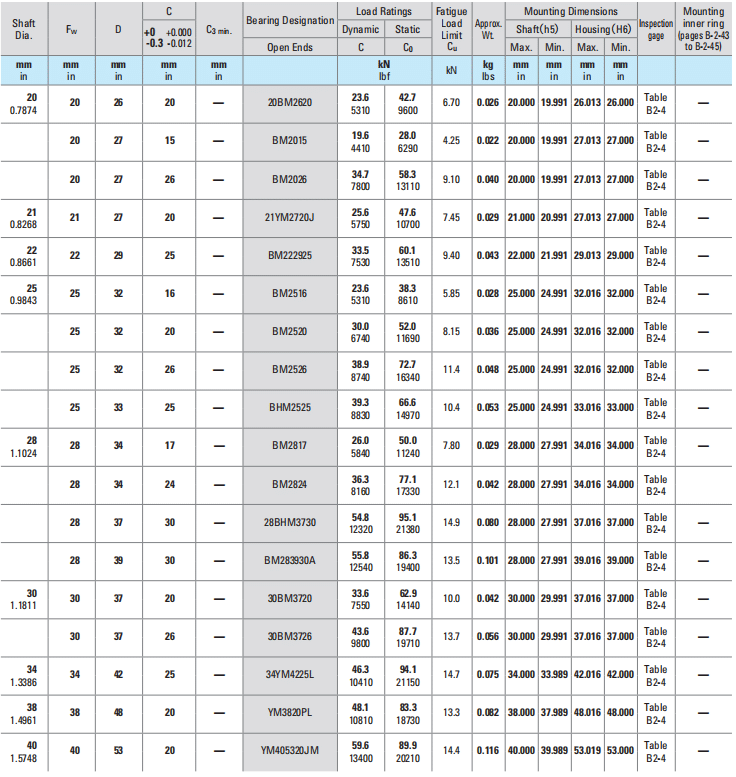 | 20 0.7874 | 20 | 26 | 20 | — | 20BM2620 | 23.6 5310 | 42.7 9600 | 6.70 | 0.026 | 20.000 | 19.991 | 26.013 | 26.000 | Table B2-4 | — |